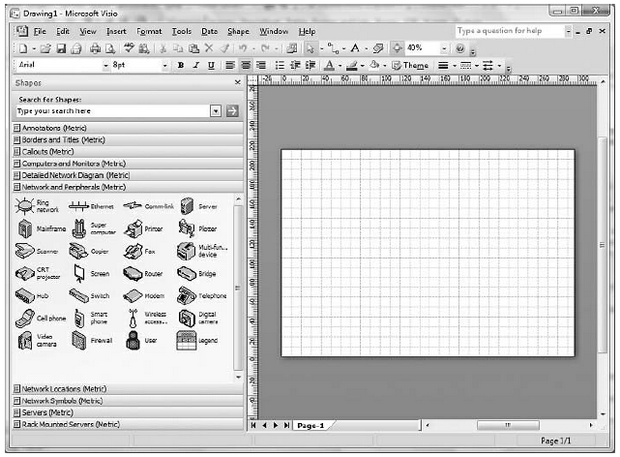 Внешне Visio похожа на другие программы семейства Microsoft Office, хотя и выглядит немного более архаично. Особенно это заметно в версии 2007 - интерфейс Visio 2007 разительно отличается (в худшую сторону) от остальных приложений MS Office и выглядит так, будто это программа из предыдущей версии "офиса". Впрочем, судите сами (рис. 7.4):