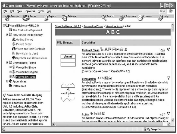 Zicom Mentor включает интерактивные курсы и тесты, документацию и справочные материалы по UML, а также потрясающий визуальный словарь UML, справочник по диаграммам и символам и др. И при этом стоит всего $ 29.95! А выглядит все это вот так (рис. 7.6):