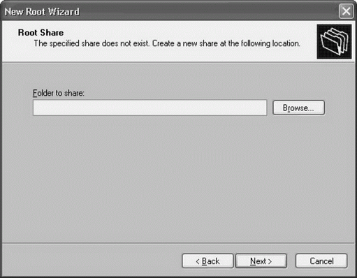 Если имя вашего корня не совпадает с именем какого-либо разделяемого ресурса на целевом компьютере, то после щелчка на кнопке Next вам будет предложено создать разделяемый ресурс, соответствующий имени корня.