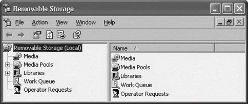 Removable Storage (Съемные ЗУ) – это часть оснастки Computer Management (Управление компьютером), для входа в которую нужно щелкнуть правой кнопкой на My Computer и выбрать пункт Manage. В дереве консоли раскройте объект Storage и затем раскройте объект Removable Storage. Кроме того, существует предварительно сконфигурированная консоль для RSM под именем ntmsmgr.msc в папке %SystemRoot%\System32. Эта оснастка содержит те же объекты, что и секция Removable Storage оснастки Computer Management. Выберите Start/Run (Пуск/Выполнить), введите ntmsmgr.msc и щелкните на кнопке OK, чтобы использовать эту отдельную оснастку.