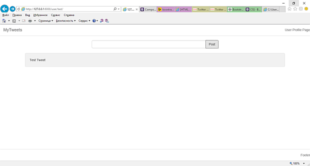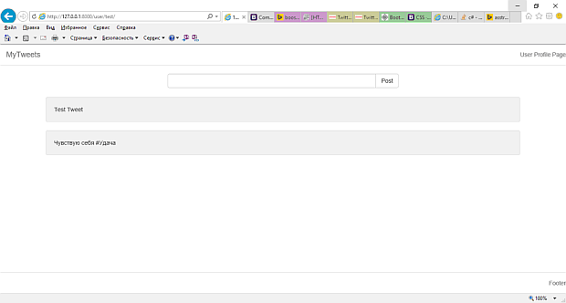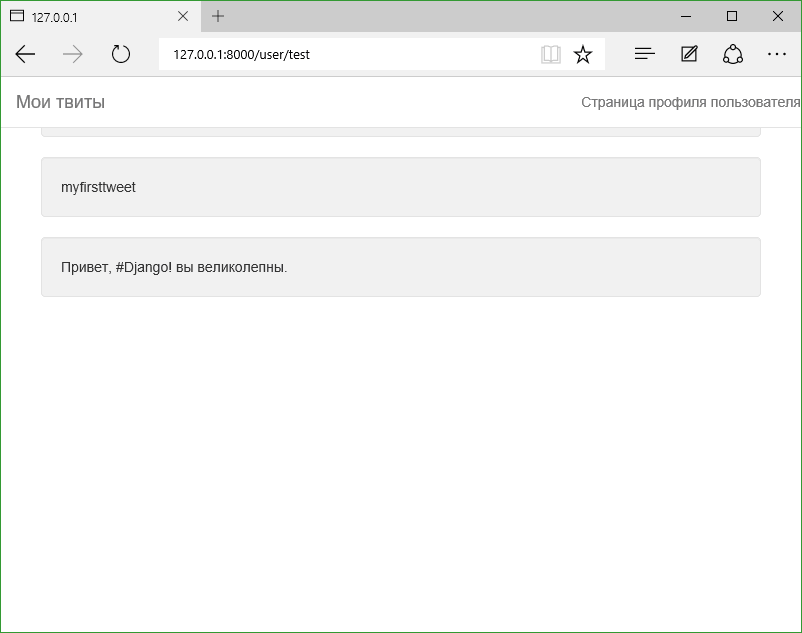 Теперь, перейдите по следующей ссылке: http: //localhost: 8000/user/test/. Вы увидите так же твиты, созданные ранее.