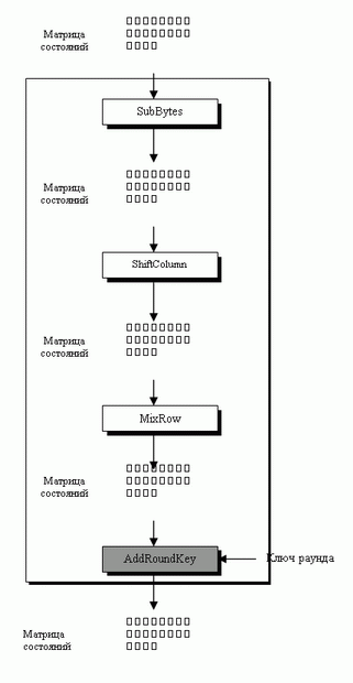 Рис. 2.15 показывает структуру каждого раунда. Каждый раунд использует четыре преобразования.