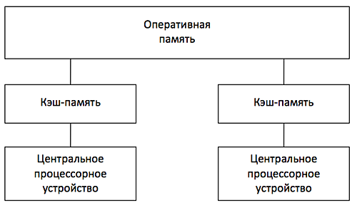 В мультипроцессоре и в многоядерной системе исполнительные устройства (процессоры и ядра процессоров) имеют доступ к разделяемой оперативной памяти. Процессоры совместно используют оперативную память.