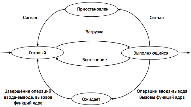 Каждый поток может находиться в одном из нескольких состояний. Поток, готовый к выполнению и ожидающий предоставления доступа к центральному процессору, находится в состоянии "Готовый". Поток, который выполняется в текущий момент времени, имеет статус "Выполняющийся". При выполнении операций ввода-вывода или обращений к функциям ядра операционной системы, поток снимается с процессора и находится в состоянии "Ожидает". При завершении операций ввода-вывода или возврате из функций ядра поток помещается в очередь готовых потоков. При переключении контекста поток выгружается и помещается в очередь готовых потоков.