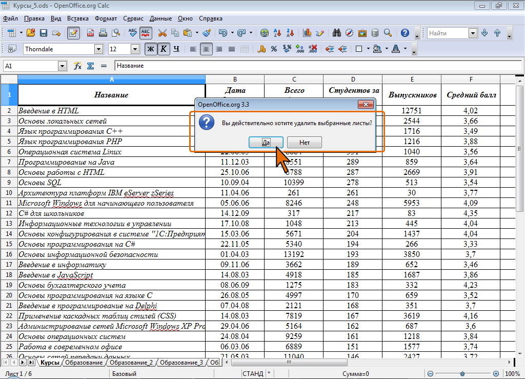 При удалении листа выйдет запрос на подтверждения действия ( рис. 8.6). Для подтверждения удаления нажмите кнопку Да.