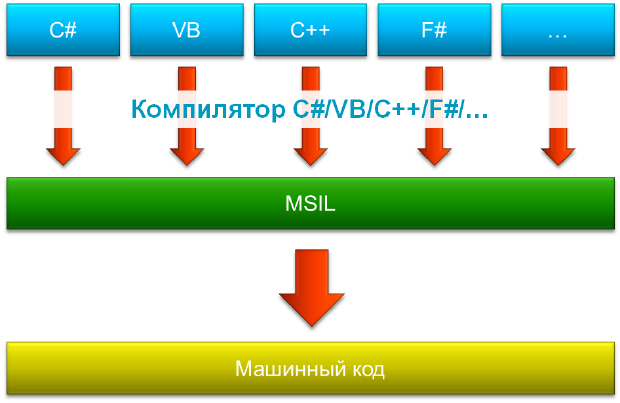 - Исходный код (на языке C#, Visual Basic или др.) преобразуется в MSIL;