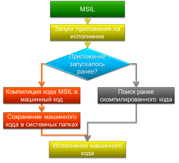 При запуске кода на языке IL происходит его преобразование в машинный код. При этом весь процесс преобразования происходит в той среде, где приложение должно быть запущено (на компьютере конечного пользователя, где исполняется приложение). Этот факт позволяет оптимизировать конечный машинный код, который получается в процессе преобразования, для той платформы, в рамках которой он будет исполняться. Также при таком подходе нет необходимости иметь две различных сборки для разных сред (32- и 64-разрядных) – конечный машинный код будет получен с учетом специфики платформы. Поскольку преобразование "MSIL – машинный код" требует определенного времени, среда исполнения записывает полученный машинный код в системных папках и при последующем запуске приложения, которое запускалось ранее, используется уже готовый код. Общий процесс компиляции выглядит следующим образом.