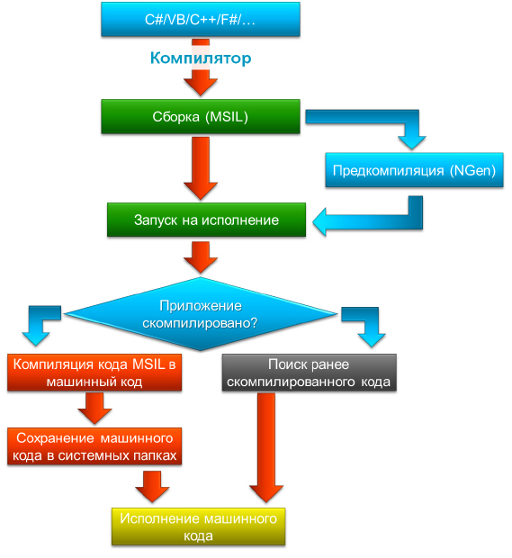 Общий процесс компиляции приложений .NET представлен на следующей схеме.