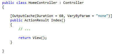 Кэширование выходного потока в приложениях ASP.NET MVC Framework реализуются аналогичным образом. Однако, вместо использования директивы страницы, используется фильтр ASP.NET MVC Framework – OutputCache.