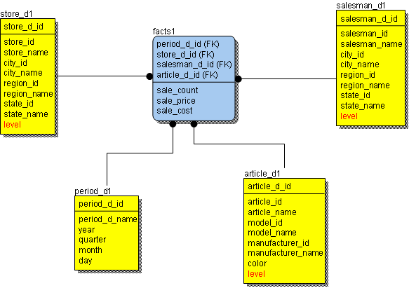 - Таблица фактов и таблицы размерности связаны идентифицирующими связями, при этом первичные ключи таблицы размерности мигрируют в таблицу фактов в качестве внешних ключей. Первичный ключ таблицы факта целиком состоит из первичных ключей всех таблиц размерности.