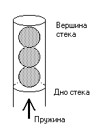Стек можно представить в виде трубки с подпружиненым дном, расположеной вертикально. Верхний конец трубки открыт, в него можно добавлять, или, как говорят, заталкивать элементы. Общепринятые английские термины в этом плане очень красочны, операция добавления элемента в стек обозначается push, в переводе "затолкнуть, запихнуть". Новый добавляемый элемент проталкивает элементы, помещеные в стек ранее, на одну позицию вниз. При извлечении элементов из стека они как бы выталкиваются вверх, по-английски pop ("выстреливают").