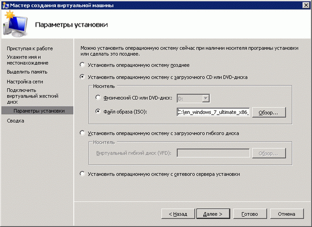 - На следующем шаге необходимо определить параметры установки гостевой ОС. По - умолчанию виртуальная машина создается без ОС. В данном примере мы будем использовать .iso - образ загрузочного диска с Windows 7. Нажмите кнопку "Далее".