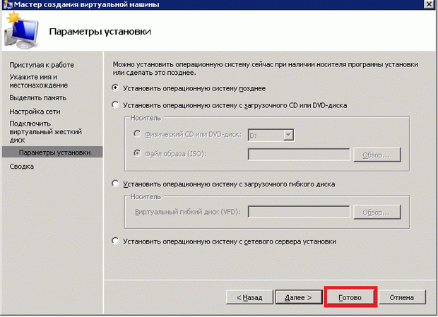 Можно создать виртуальную машину, не настраивая вышеуказанных параметров, достаточно только нажав кнопку "Готово" на первом шаге мастера создания виртуальной машины. В этом случае будет создана виртуальная машина с следующей конфигурацией по - умолчанию: