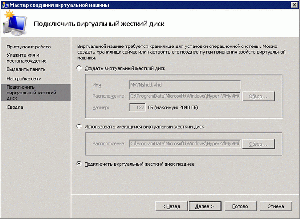 - Укажите параметры виртуального жесткого диска создаваемой виртуальной машины. Можно как создать новый виртуальный HDD, так и использовать уже имеющийся. Кроме того, виртуальный HDD можно будет подключить к ВМ позднее. Нажмите кнопку "Далее".