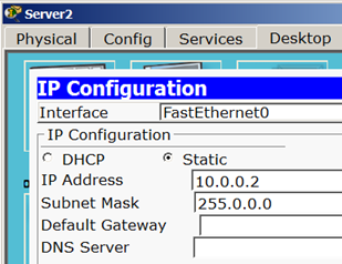 Задайте в конфигурации серверов настройки IP: Server1 – 10.0.0.1 ( рис. 6.7), Server2 – 10.0.0.2 ( рис. 6.8). Маска подсети установится автоматически как 255.0.0.0.