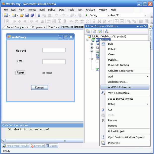 namespace WebProxy { partial class WebProxy { private System.ComponentModel.IContainer components = null; protected override void Dispose(bool disposing) { if (disposing && (components != null)) { components.Dispose(); } base.Dispose(disposing); } #region Windows Form Designer generated code private void InitializeComponent() { this.label1 = new System.Windows.Forms.Label(); this.textBox1 = new System.Windows.Forms.TextBox(); this.textBox2 = new System.Windows.Forms.TextBox(); this.button1 = new System.Windows.Forms.Button(); this.label2 = new System.Windows.Forms.Label(); this.label3 = new System.Windows.Forms.Label(); this.label4 = new System.Windows.Forms.Label(); this.SuspendLayout(); // // label1 // this.label1.AutoSize = true; this.label1.Location = new System.Drawing.Point(152, 135); this.label1.Name = "label1"; this.label1.Size = new System.Drawing.Size(47, 13); this.label1.TabIndex = 0; this.label1.Text = "no result"; // // textBox1 // this.textBox1.Location = new System.Drawing.Point(155, 33); this.textBox1.Name = "textBox1"; this.textBox1.Size = new System.Drawing.Size(100, 20); this.textBox1.TabIndex = 1; // // textBox2 // this.textBox2.Location = new System.Drawing.Point(155, 83); this.textBox2.Name = "textBox2"; this.textBox2.Size = new System.Drawing.Size(100, 20); this.textBox2.TabIndex = 2; // // button1 // this.button1.Location = new System.Drawing.Point(105, 194); this.button1.Name = "button1"; this.button1.Size = new System.Drawing.Size(75, 23); this.button1.TabIndex = 3; this.button1.Text = "Convert"; this.button1.UseVisualStyleBackColor = true; this.button1.Click += new System.EventHandler(this.button1_Click); // // label2 // this.label2.AutoSize = true; this.label2.Location = new System.Drawing.Point(38, 39); this.label2.Name = "label2"; this.label2.Size = new System.Drawing.Size(48, 13); this.label2.TabIndex = 4; this.label2.Text = "Operand"; // // label3 // this.label3.AutoSize = true; this.label3.Location = new System.Drawing.Point(41, 83); this.label3.Name = "label3"; this.label3.Size = new System.Drawing.Size(31, 13); this.label3.TabIndex = 5; this.label3.Text = "Base"; // // label4 // this.label4.AutoSize = true; this.label4.Location = new System.Drawing.Point(41, 134); this.label4.Name = "label4"; this.label4.Size = new System.Drawing.Size(37, 13); this.label4.TabIndex = 6; this.label4.Text = "Result"; // // WebProxy // this.AutoScaleDimensions = new System.Drawing.SizeF(6F, 13F); this.AutoScaleMode = System.Windows.Forms.AutoScaleMode.Font; this.ClientSize = new System.Drawing.Size(292, 266); this.Controls.Add(this.label4); this.Controls.Add(this.label3); this.Controls.Add(this.label2); this.Controls.Add(this.button1); this.Controls.Add(this.textBox2); this.Controls.Add(this.textBox1); this.Controls.Add(this.label1); this.Name = "WebProxy"; this.Text = "WebProxy"; this.Load += new System.EventHandler(this.WebProxy_Load); this.ResumeLayout(false); this.PerformLayout(); } #endregion private System.Windows.Forms.Label label1; private System.Windows.Forms.TextBox textBox1; private System.Windows.Forms.TextBox textBox2; private System.Windows.Forms.Button button1; private System.Windows.Forms.Label label2; private System.Windows.Forms.Label label3; private System.Windows.Forms.Label label4; } }27.1. - Добавьте веб-ссылку http://localhost/ASPNETCalcWebService/Service.asmx на веб-службу ASPNETCalcWebService в проект: