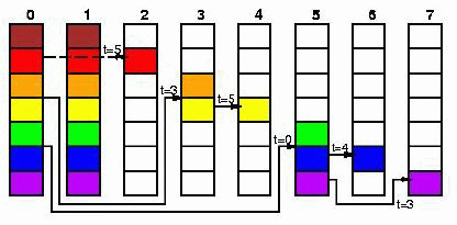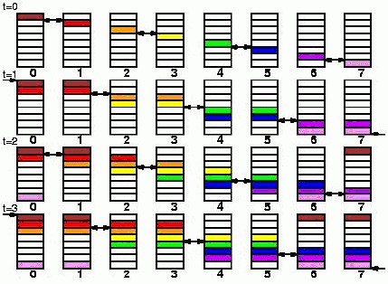 Long (bandwidth reducing): В отличие от предыдущих вариантов, требует синхронизации всех процессов, участвующих в вычислении, для выполнения операции обмена. Передаваемый блок данных разделяется на Q частей, после чего "разбрасывается" по всем процессам, причем обмен разными частями сообщения происходит в разные моменты времени (фаза распределения). После этого, происходят попарные обмены полученными частями сообщений между процессорами (фаза обмена):